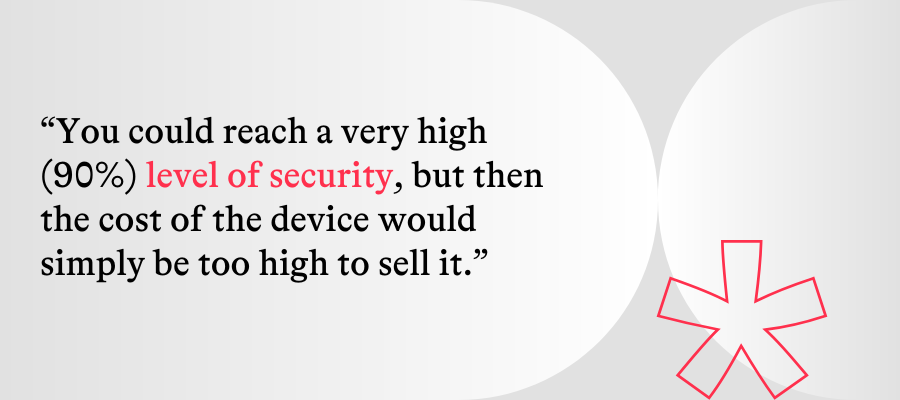 Reaching a security level of 100% is impossible to achieve, not to mention it wouldn’t be feasible. That said, you could reach a very high level of security – say, 90% – but then the cost of the device would simply be too high to sell it.