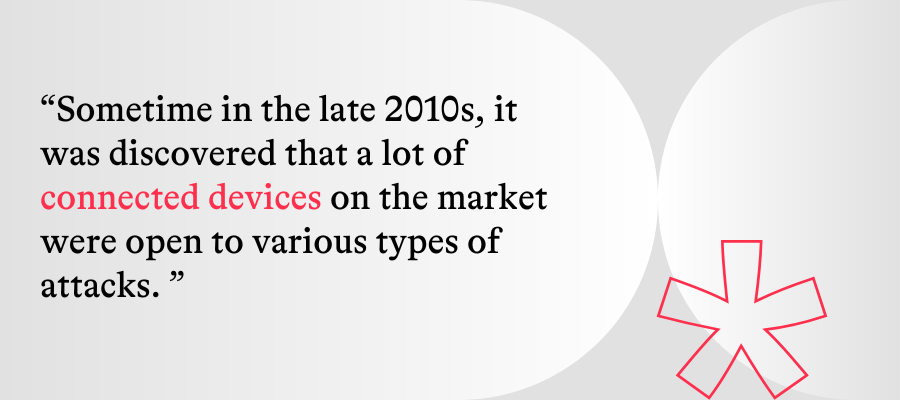 The issue of security started to become important around the late 2010s when hackers took an interest in the devices that were on the market. It was then discovered that a lot of connected devices were open to various types of attacks, and breaking into them wasn’t difficult.