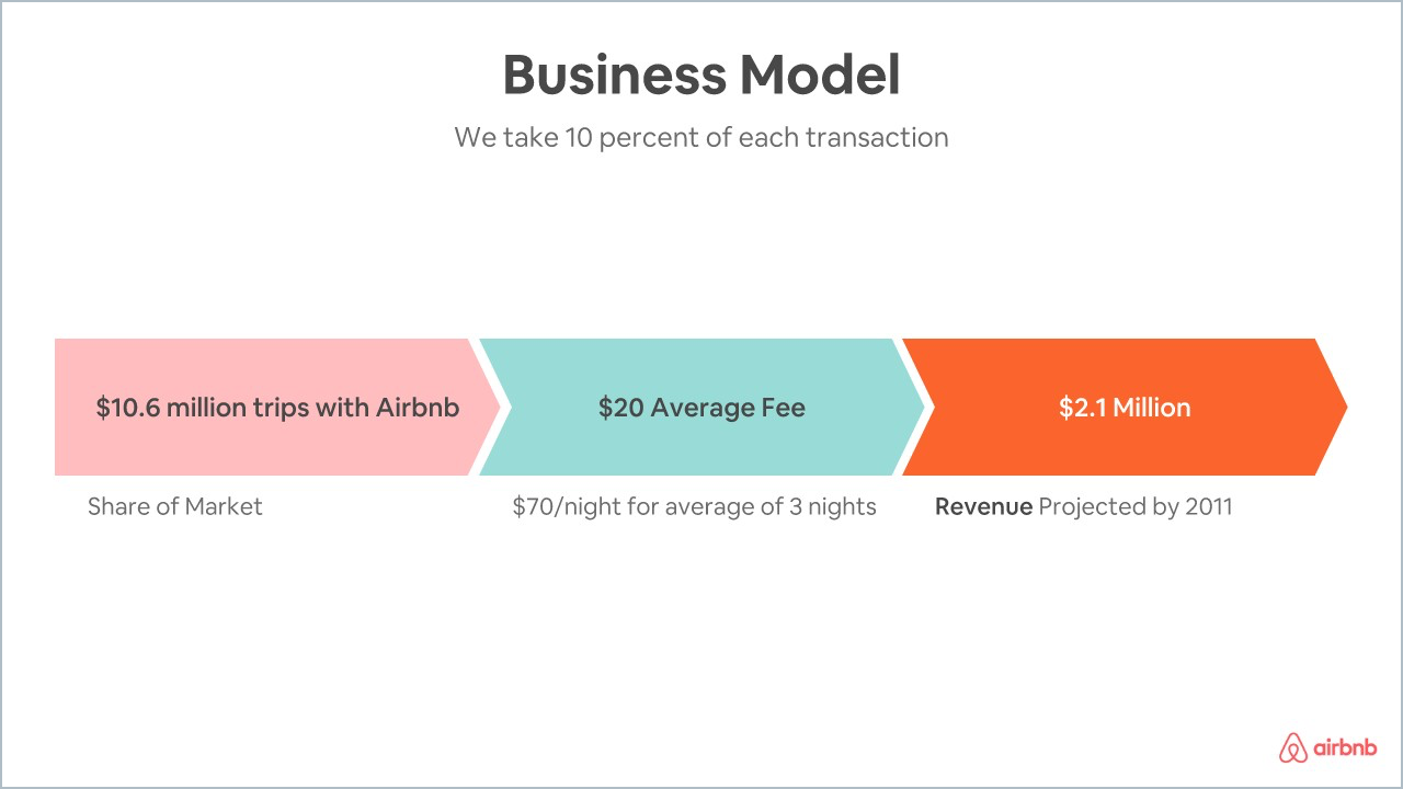 Airbnb’s business model slide is very clear and takes investors from market size to revenue projections in three steps. Source: Airbnb / Beautiful AI