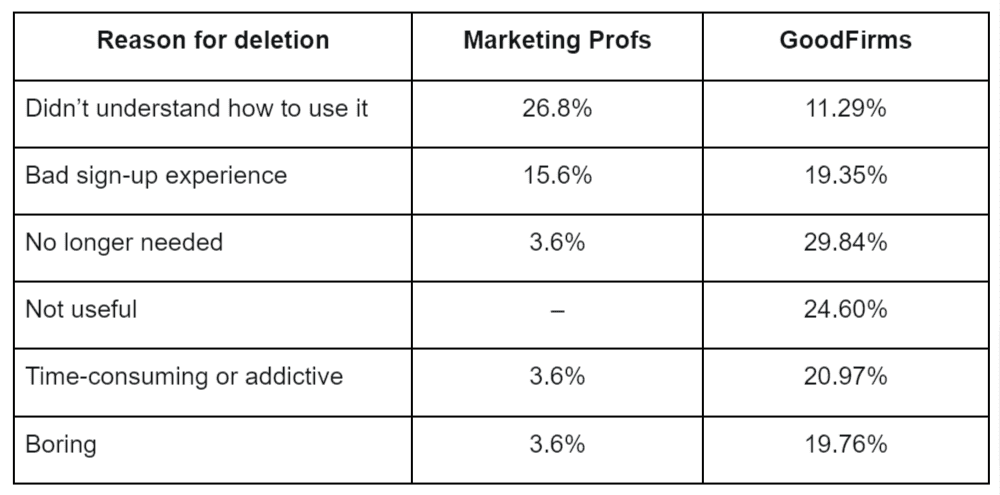 A study by GoodFirms showed similar results, i.e., 19.35% of users cited bad sign-up experiences and 11.29% lack of understanding of how to use the app as the reason for uninstallation.