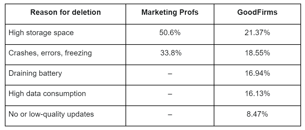 A key factor that impacts users’ decision to uninstall an app is the overall app performance. Both Marketing Profs and GoodFirms surveys show that: